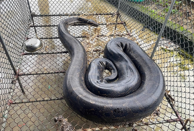 Con trăn được gia đình ông Minh nhốt vào lồng sắt. Ảnh: Hùng Lê