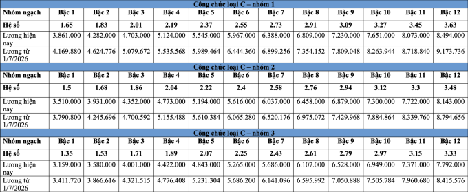 Bảng lương công chức dự kiến từ 1/7/2026 như sau: