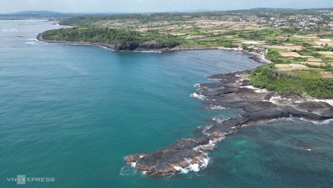 Gành Yến với đá núi lửa và những cánh đồng hành tỏi của người dân xã Bình Hải cũ. Ảnh: Phạm Linh