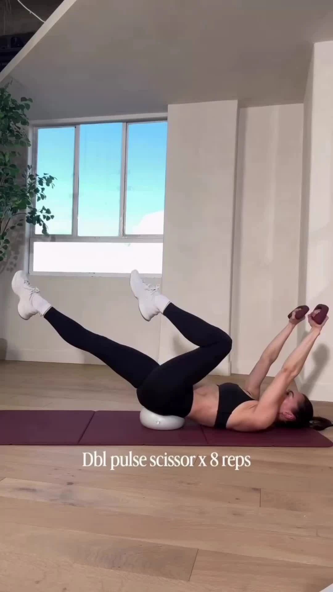 Gập bụng lăn bóng (Cross-body crunch with ball roll - 8 lần)