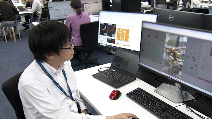 Nhân viên công ty khí tượng nhận ảnh hoa anh đào nở do người dân và du khách gửi về. Ảnh: NHK