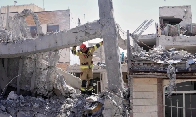 Nhân viên cứu hộ có mặt tại hiện trường một tòa nhà dân cư bị trúng tập kích ở thủ đô Tehran,Iran,hồi tháng 3. Ảnh: AP