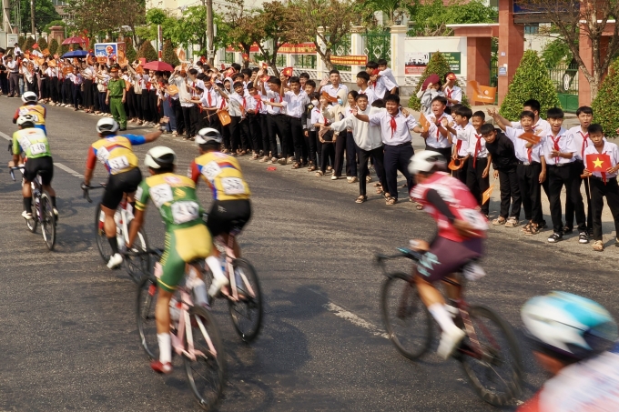 Học sinh cổ vũ các tay đua chặng 12 giải xe đạp toàn quốc tranh Cup Truyền hình HTV 2025 từ Quảng Ngãi đi Quy Nhơn (Gia Lai) trưa 15/4. Ảnh:Hồng Phương