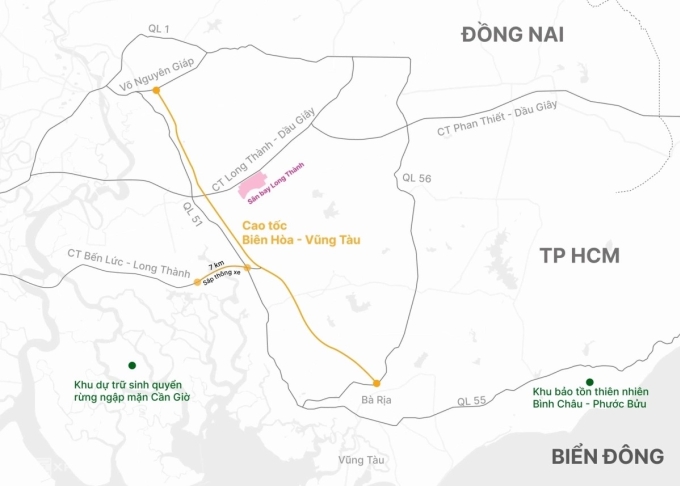 Cao tốc Biên Hòa - Vũng Tàu dài gần 54 km,quy mô 4-6 làn xe,tổng vốn khoảng 17.800 tỷ đồng. Khi đưa vào khai thác,tuyến sẽ giảm tải cho quốc lộ 51 và cao tốc TP HCM - Long Thành,rút ngắn thời gian đi từ TP HCM đến Vũng Tàu từ khoảng 120 xuống còn 70 phút.