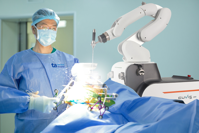 Bác sĩ Học sử dụng robot Cuvis-Joint có tích hợp trí tuệ nhân tạo AI thay khớp gối cho bà Hồng. Ảnh: Bệnh viện Đa khoa Tâm Anh